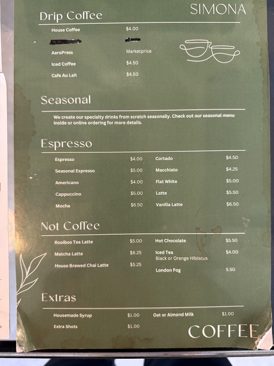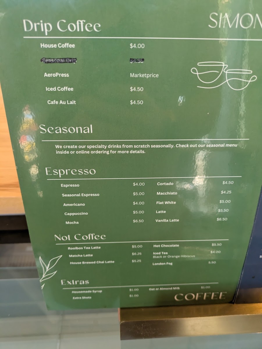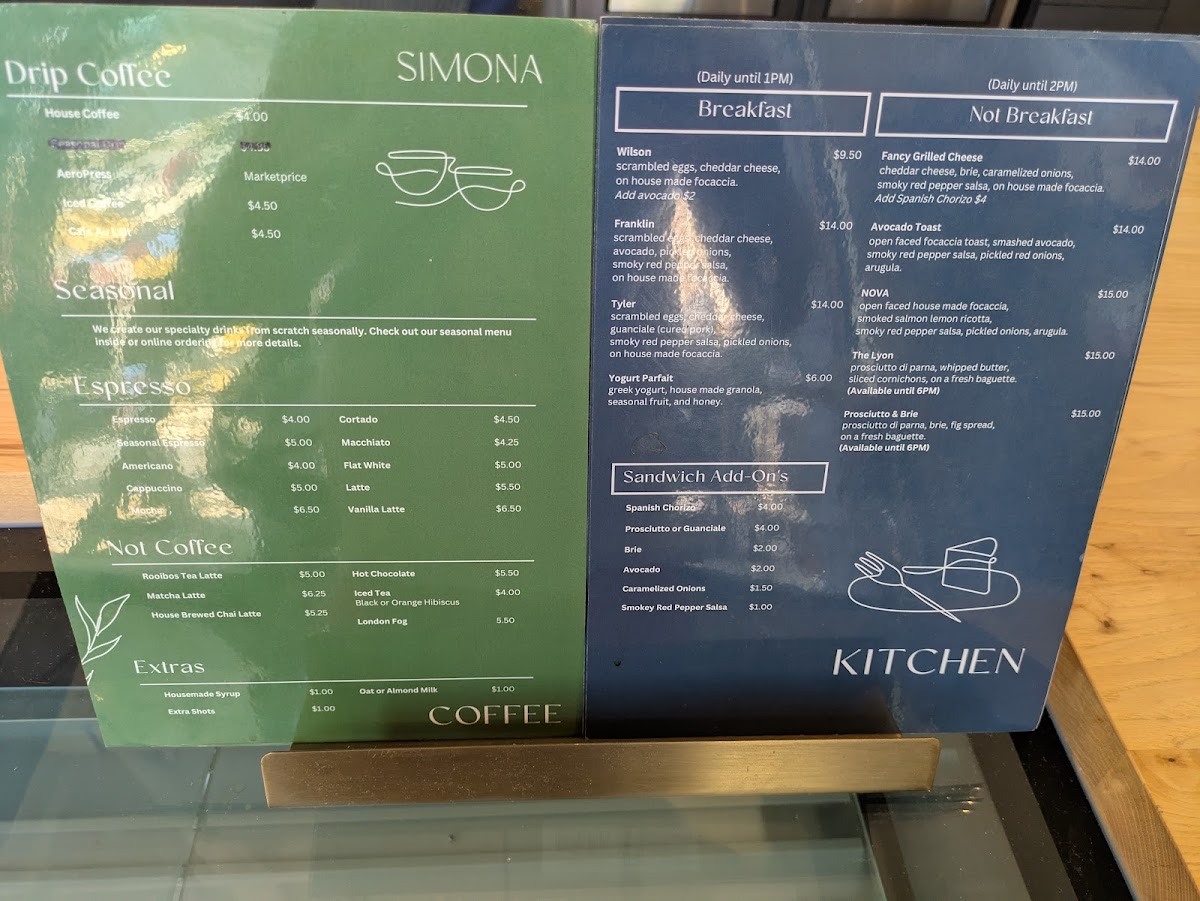Welcome to Simona Cafe, a charming spot nestled in Washington, DC. This café delights with its carefully curated menu, offering a rich selection of coffee and espresso, including the vibrant Birdie Blend from Brazil, Mexico, and Ethiopia. Try their creamy lattes or indulge in the house-specialty cold brew, steeped to perfection. For tea lovers, hand-blended options like the flavorful London Fog and the aromatic chai tea latte are available, complementing the café’s warm atmosphere.